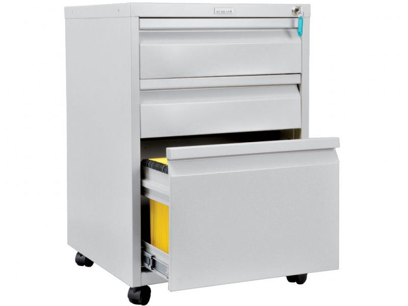 В современных офисах имеется острая необходимость в многофункциональной мебели, способной решать самые разнообразные вопросы, которые могут возникать в ходе работы. Мобильные металлические тумбы призваны решать различные задачи по удобству размещения используемых канцтоваров, персональных вещей работника, папок формата А4 – подвесных папок Foolscap или папок типа «Корона». Направляющие телескопического строения в металлических тумбах отвечают за легкое и полное открывание ящиков, а наличие ключевых замков позволяет одним оборотом ключа заблокировать все ящики. Большинство современных мобильных тумб оснащены антиопрокидывающим устройством, позволяющим сохранять устойчивость тумбы даже при одновременном открытии всех ящиков.