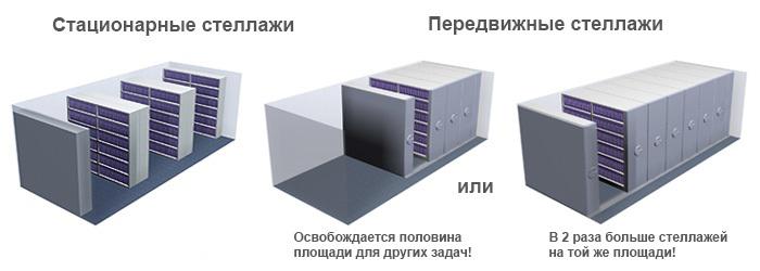 Мобильные архивные стеллажи имеют возможность посекционного соединения для образования линий стеллажей необходимой длины. Это позволяет не только сократить количество проходов к искомой документации или группе товаров, но также значительно рациональнее использовать полезную площадь помещения. Подсчитано, что при правильной организации хранения эффективность использования имеющейся площади склада или архива достигает 75-90%.