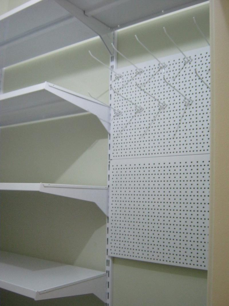 задняя стенка, собирается из панелей со сплошной или перфорированной поверхностью, где отверстия служат для установки крючков, на которые вывешивается товар.