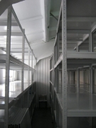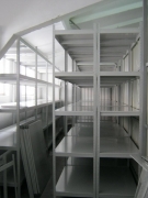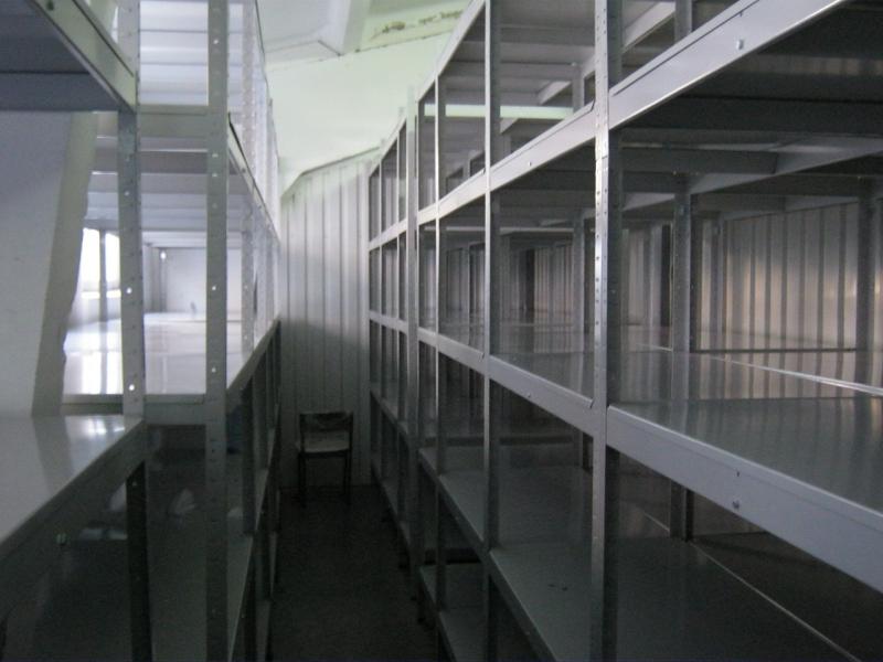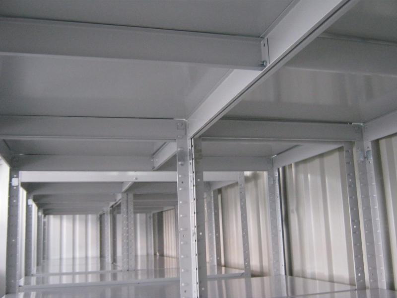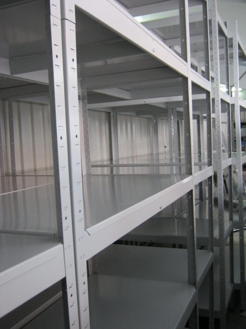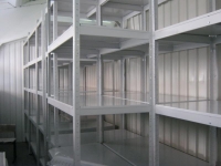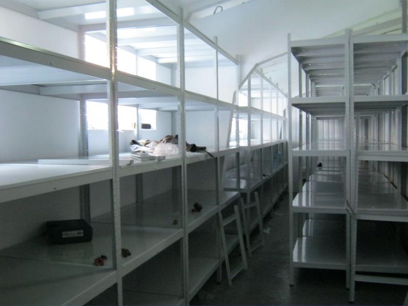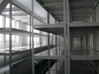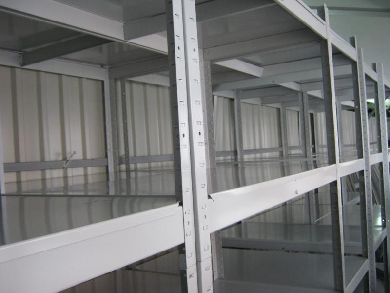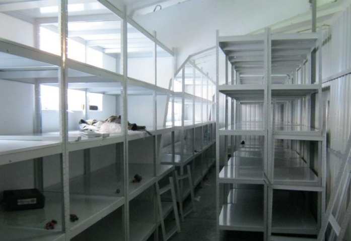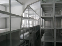 Основные характеристики стеллажей: высота – 2600 мм, 5 полок, нагрузка на полку до 150 кг. Каркас стеллажей и полки окрашены порошковой краской.