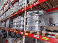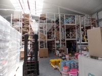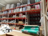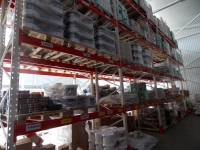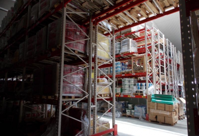 Паллетные стеллажи имеют высоту 5800 мм. Хранение происходит на пяти уровнях: 4 уровня хранения на траверсах и один уровень хранения на полу. Товары упаковываются на евро паллеты и устанавливаются на стеллажи при помощи погрузочной техники. Один уровень хранения выдерживает нагрузку до 4000 кг.