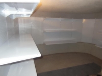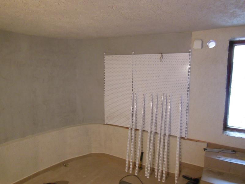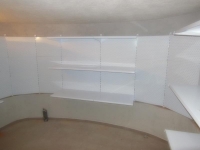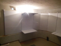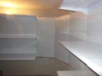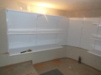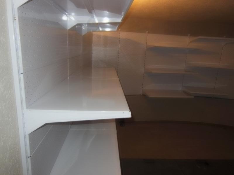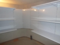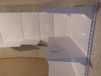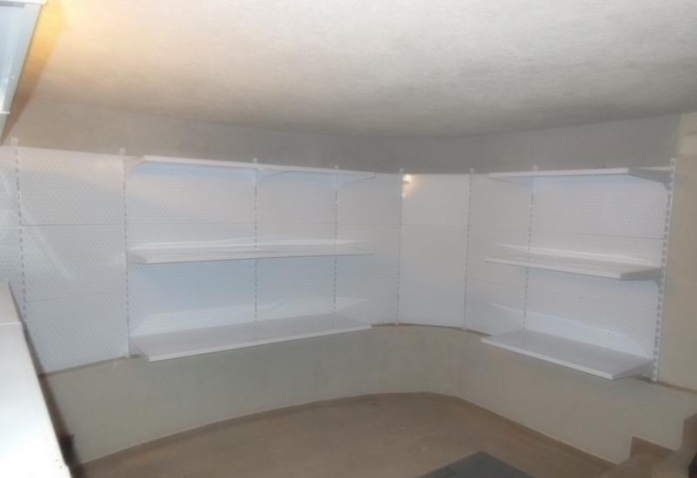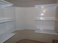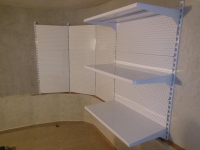 Для реализации задачи, совместно с клиентом, были выбраны настенные торговые стеллажи. Монтаж стеллажей проводился следующим образом - вертикальные рейки, посредством анкеров, крепили к стенам. Затем на эти рейки, через зацепы, монтировалась перфорированная задняя стенка и кронштейны, в пазы которых укладывались полки. Конструкция стеллажей была смонтирована по всему периметру помещения.