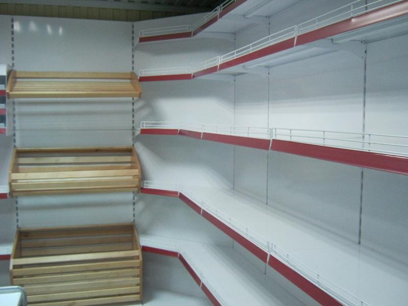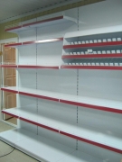 - обычными полками – для разного вида товара. На каждой полке установлены барьеры и по торцам красные ценникодержатели.