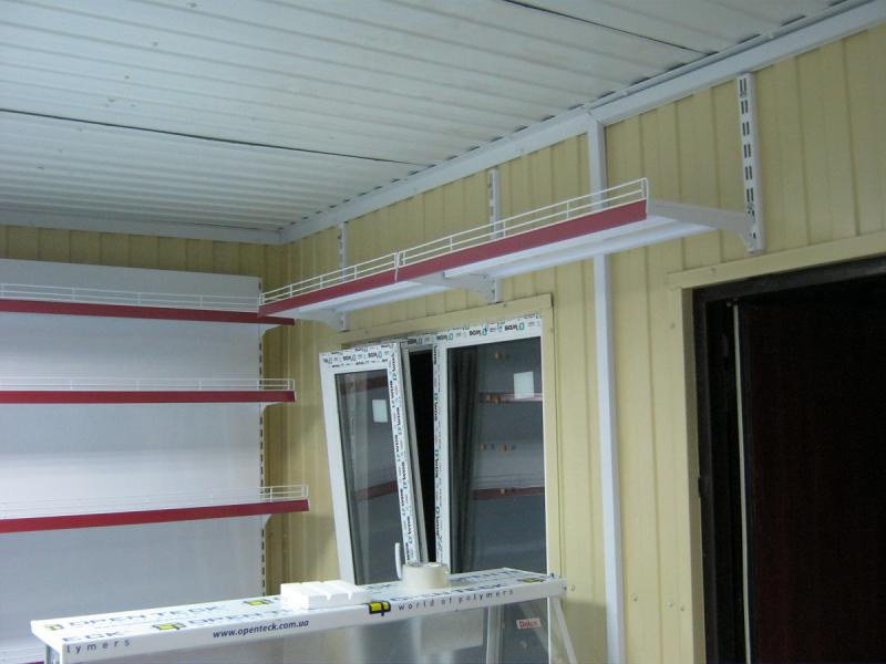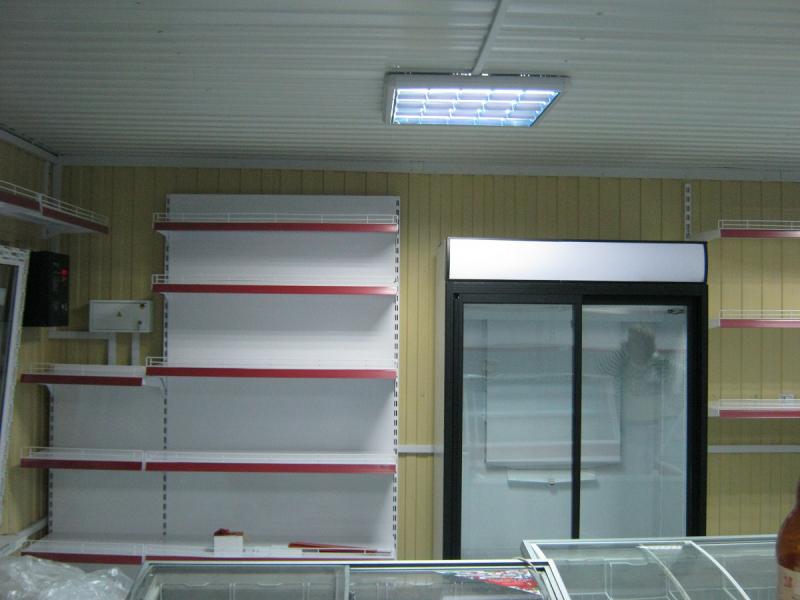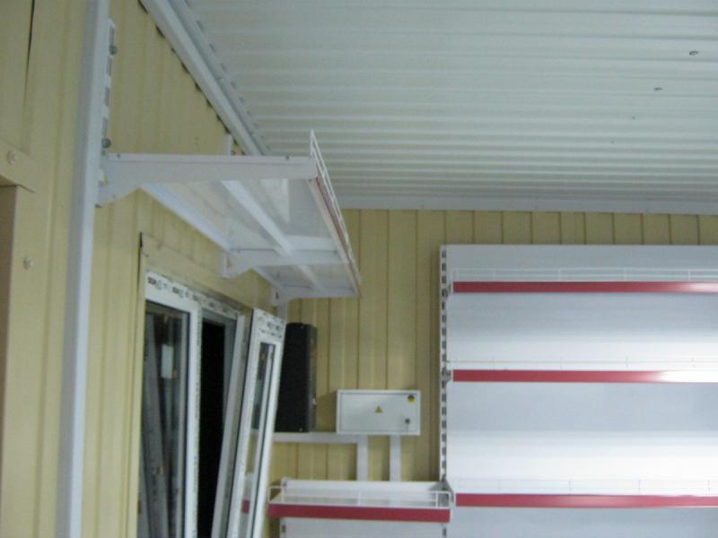 Для того, чтобы использовать площадь торгового помещения по максимуму, в местах над окнами и над холодильным оборудованием установлены настенные стеллажи.