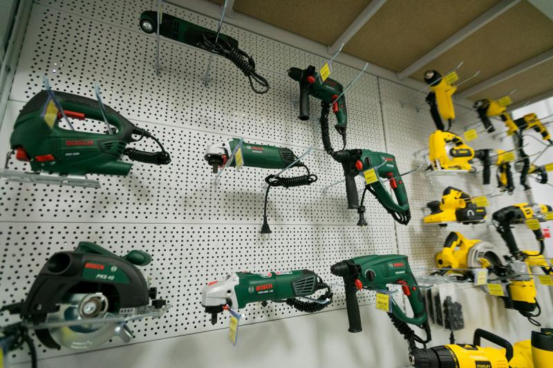 Стелажі для магазину інструментів та матеріалів можуть бути без полиць, але із задньою перфорованою стінкою, в отворах якої монтуються різного виду навісні пристрої для більш наочної презентації товару.