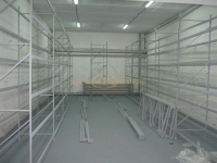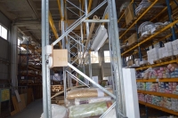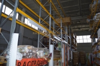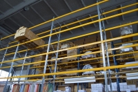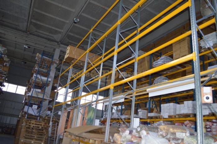 На складі вже було встановлено палетні стелажі іноземного виробника (на фото сині вертикальні рами та помаранчеві горизонтальні балки). На ці стелажі додатково доставили два рівні зберігання по висоті (на фото жовті горизонтальні балки). Також для більш ефективного використання складського приміщення встановили два ряди палетних стелажів.