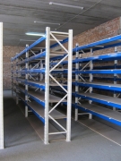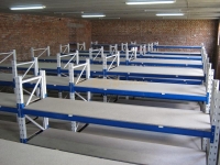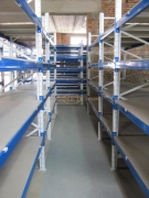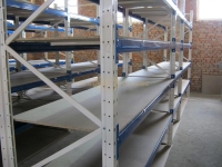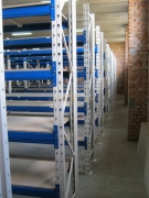Конструкція стелажів пофарбована в корпоративний колір клієнта. Рами у білий колір, траверси (поздовжні балки) у синій. Для зменшення вартості всього проекту перший ярус полкового зберігання вирішили розмістити на підлозі, а не на траверсах. Як настил використовується ДСП.