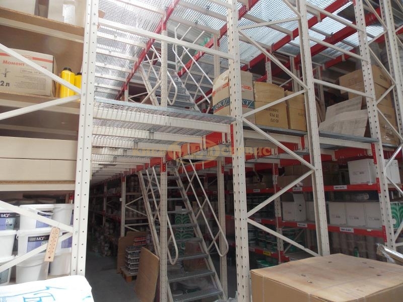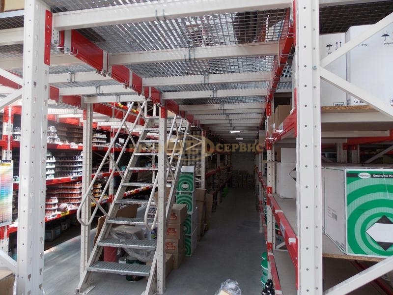 Мезонін висотою 6250 мм має три поверхи. Зберігання товарів відбувається на полицях. Ця конструкція забезпечує прямий доступ до товарів, розміщених навіть на верхніх ярусах.