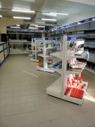 За контуром приміщення вздовж стін, встановлені пристінні стелажі. Кожен стелаж розділений за групою товарів.