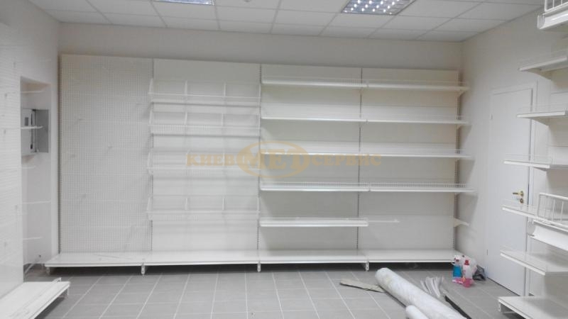Всі стелажі висотою 2380 мм, з різною глибиною подіуму (нижньої полиці) 420 мм, 520 мм та 620 мм. Кількість полиць у пристінних стелажах 5 шт і по одній полиці в перфорованих стелажах. Усі полиці укомплектовані фронтальними бар'єрами. Стелаж із кошиками – має два кошики 500 мм та два 400 мм, з роздільниками кошика в комплекті.
