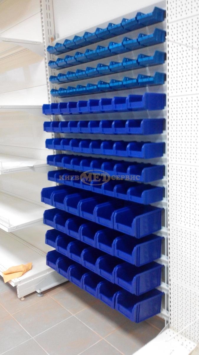 Стелаж для пластикової тари використовується для зберігання металовиробів. Висота 1800 мм, довжина 1000 мм. У комплекті 24 великі ящики - 701, 45 ящиків середніх - 702 та 36 ящиків малих -703. Усі ящики синього кольору.
